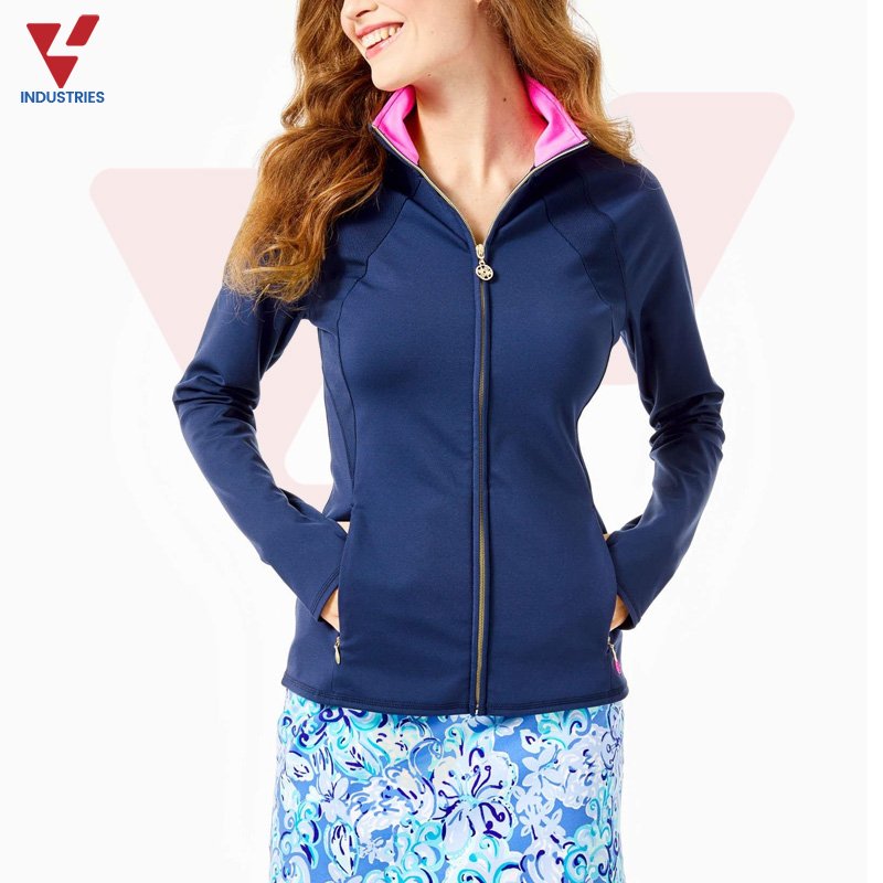 - UPF 50+ Luxletic full zip-jacket with rib knit insets, thumb holes and zipper pockets.